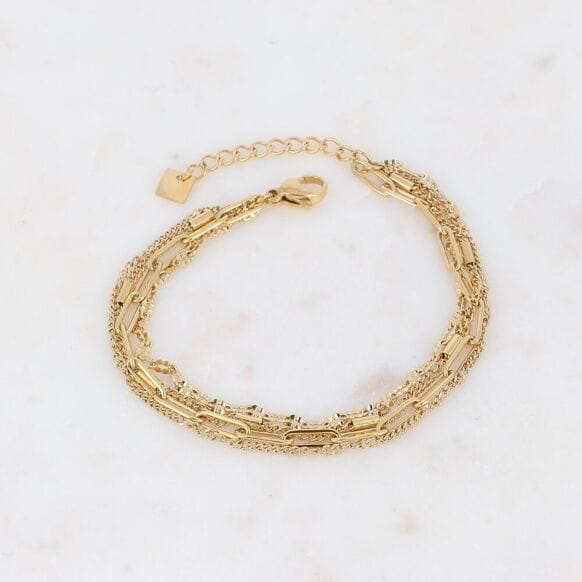 Deze fraaie goudkleurige roestvrij stalen armband bestaat uit 4 rijen van verschillende schakels. Dat geeft de armband een speelse en elegante uitstraling die matcht met vrijwel elke outfit.