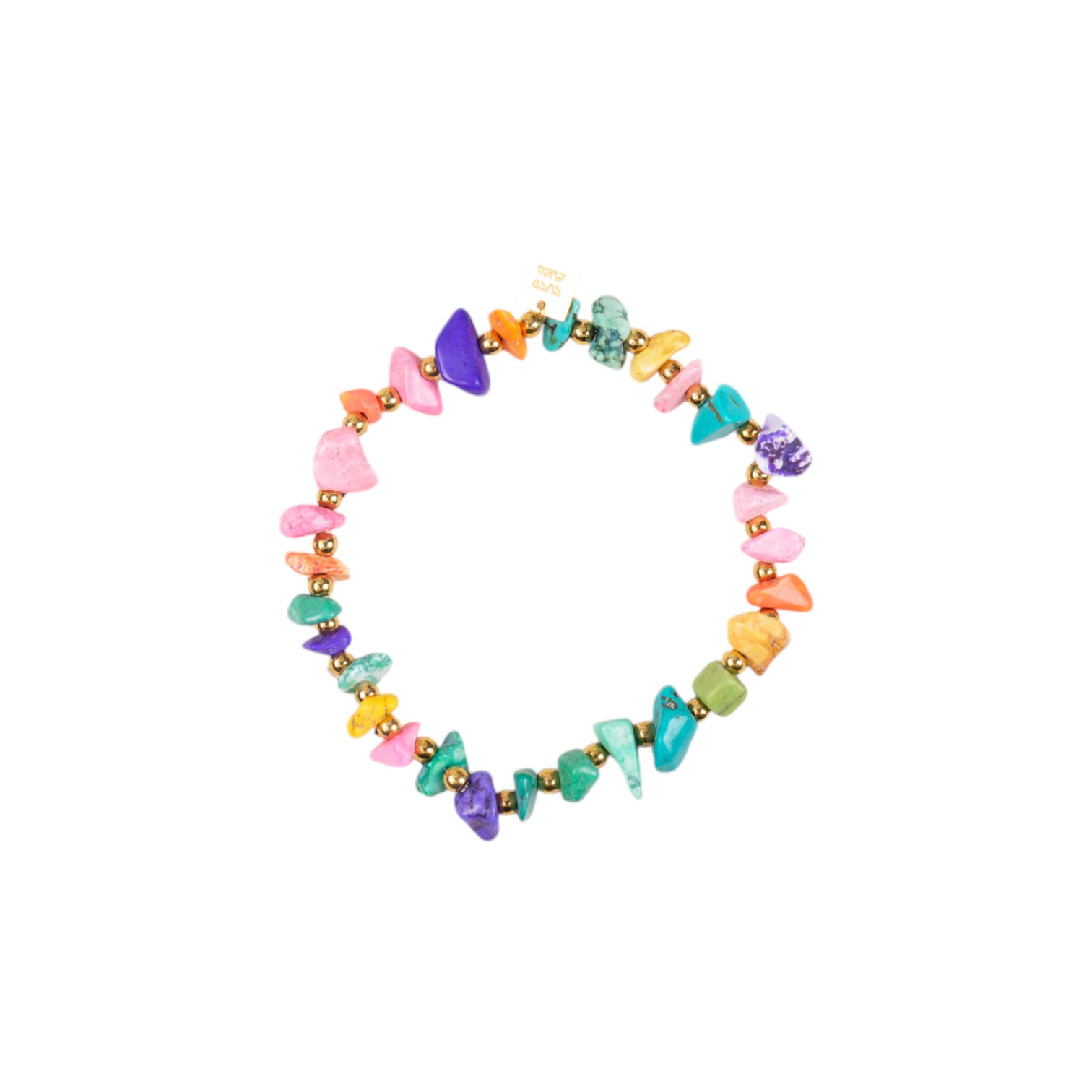 Deze fraaie armband van CUCO CUCA bestaat uit prachtige kleurrijke natuursteentjes met daartussen goudkleurige Stainless Steel kraaltjes.