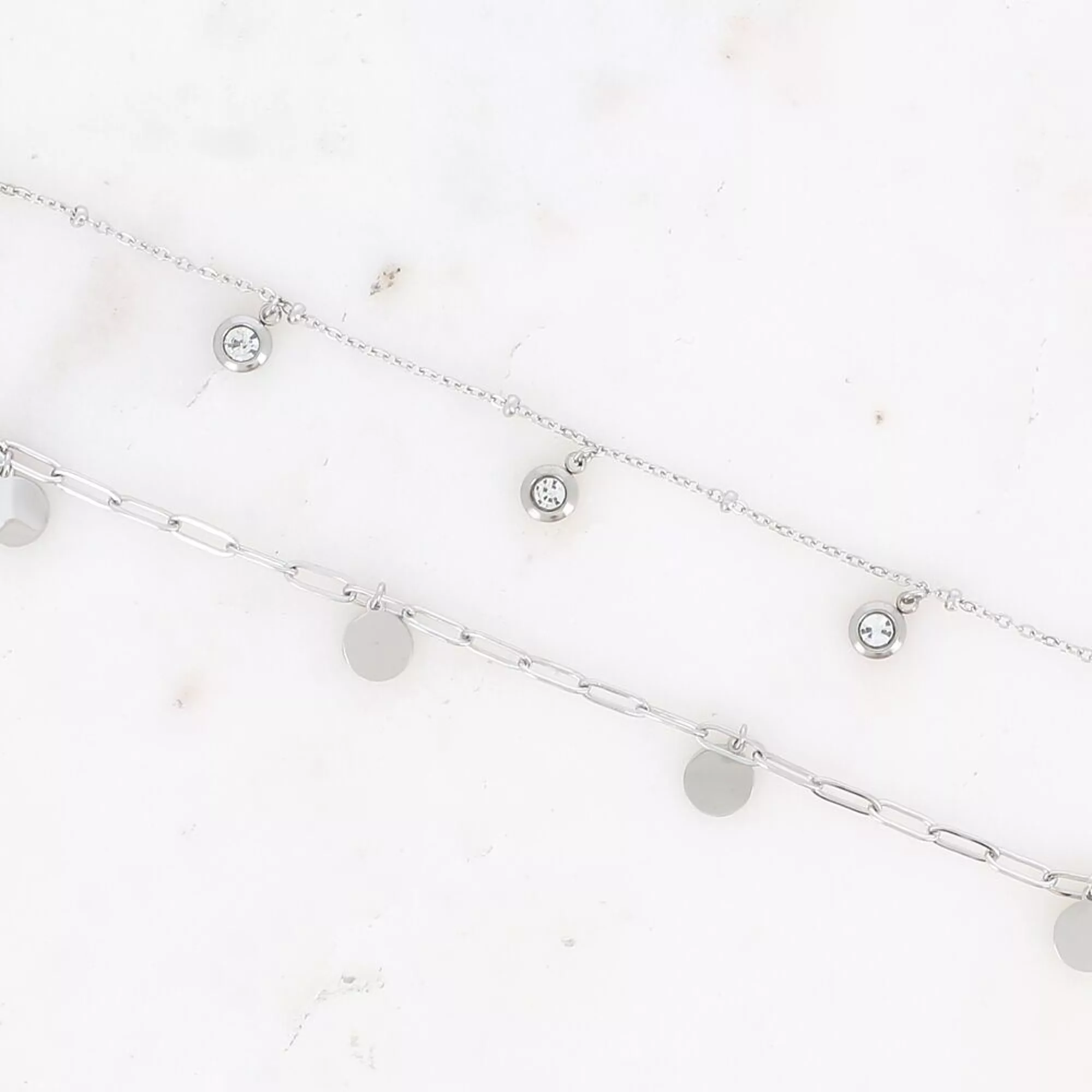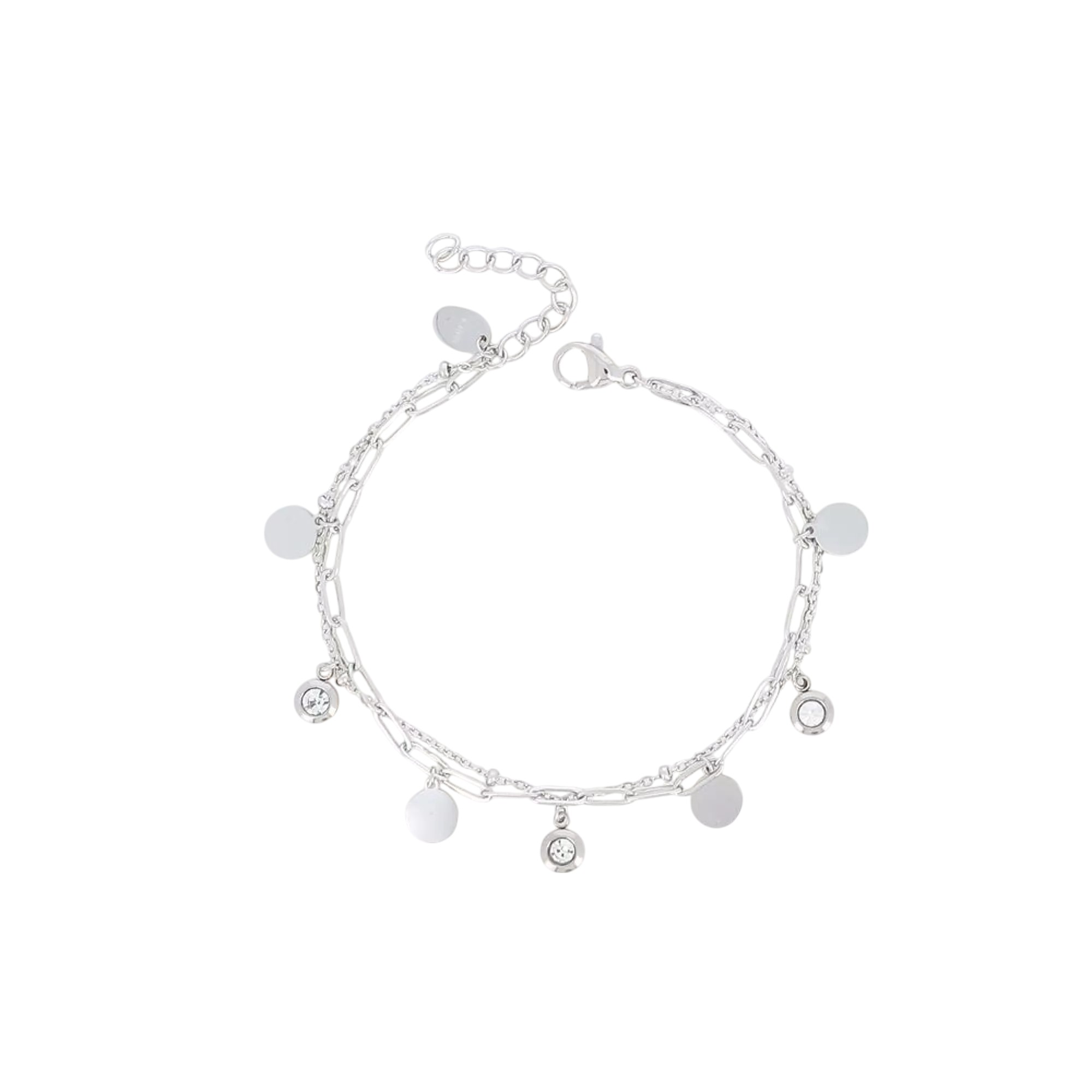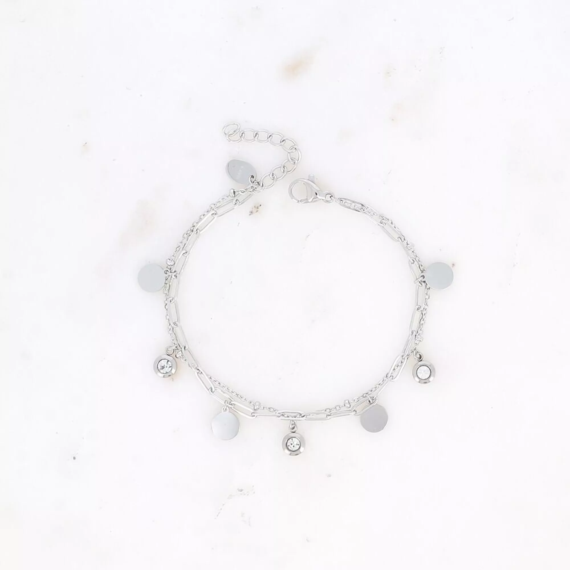 Deze 2-rijige armband van Bohm Paris bestaat uit een roestvrijstalen ketting met stalen bolletjes en geslepen kristallen; en een ketting versierd met platte ronde kwastjes. Erg sierlijk en te combineren met vrijwel elke outfit.