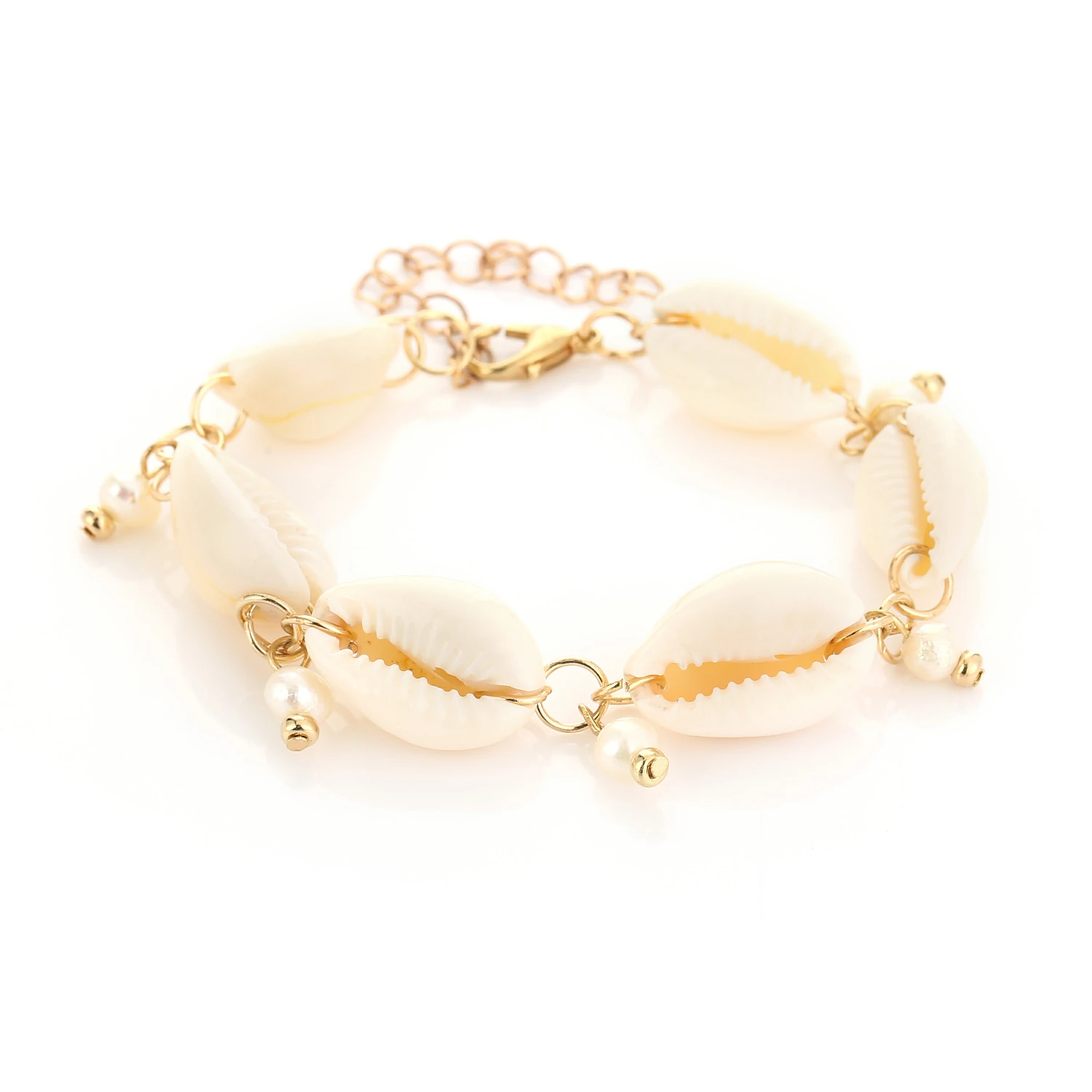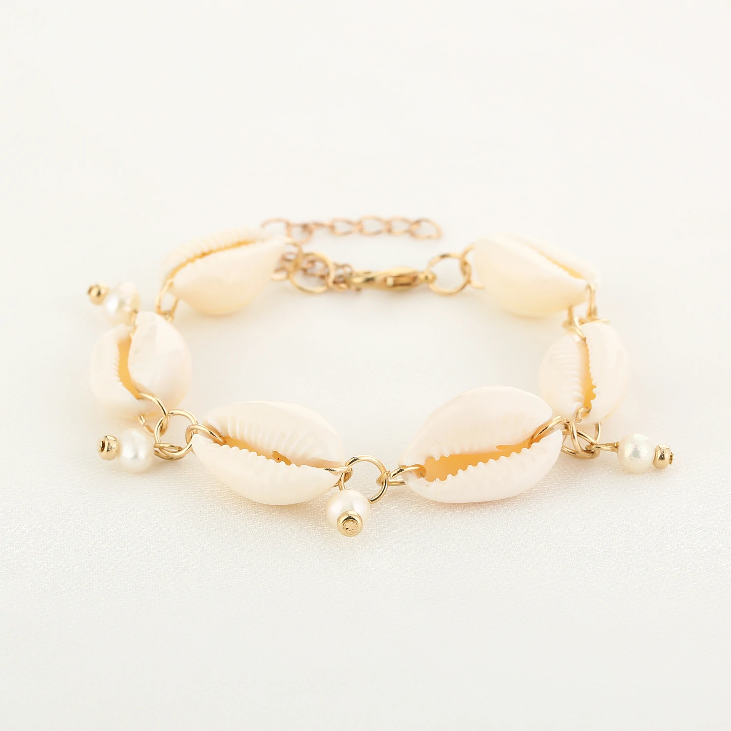 • Armband met schelpjes en bedels van parel en goudkleurig kraaltje