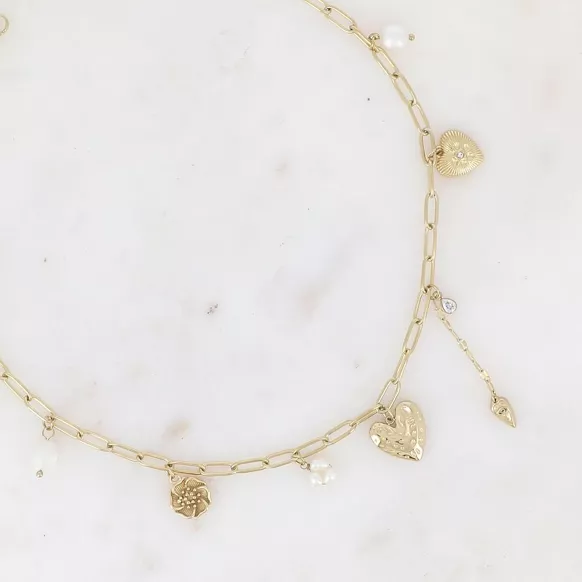 Deze prachtige goudkleurige roestvrijstalen ketting is geschakeld met langwerpige ovale ringen, versierd met verschillende bedels (hartjes, bloemen, sterren, zoetwaterparels en kristallen). Dat geeft de ketting een fleurige en frivole uitstraling, maar dankzij het verfijnde ontwerp toch elegant.