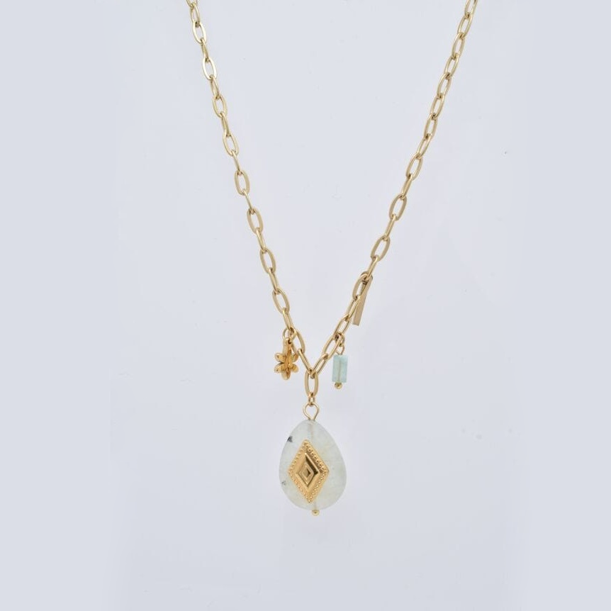 Roestvrijstalen ketting bestaande uit een diverse hangers met een grote natuursteen in de kleur mintgroen.