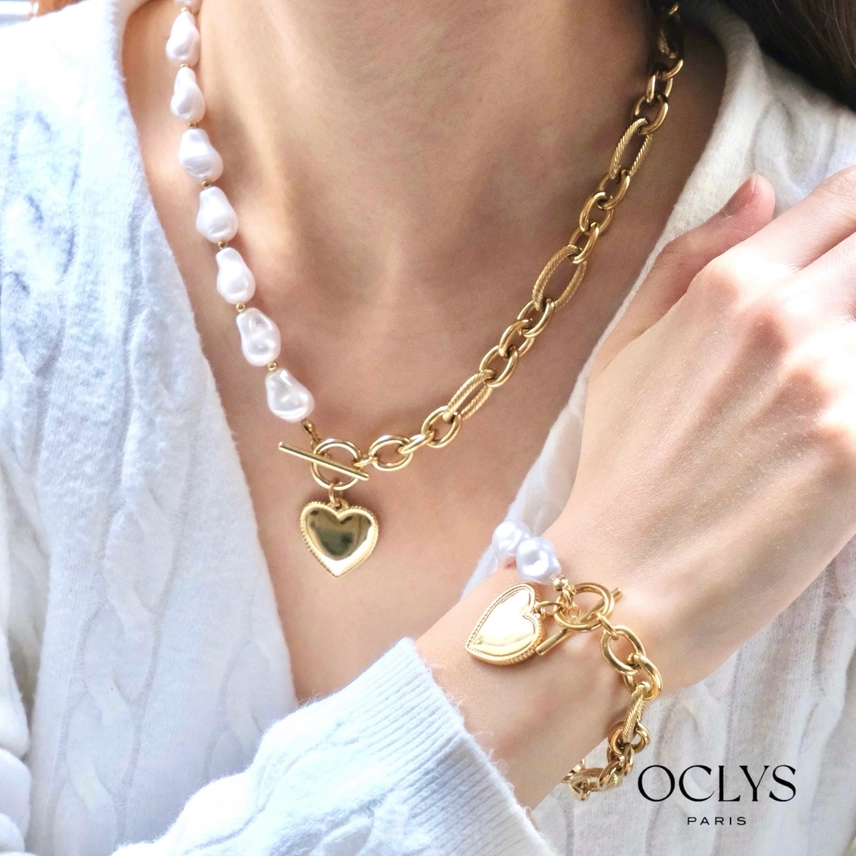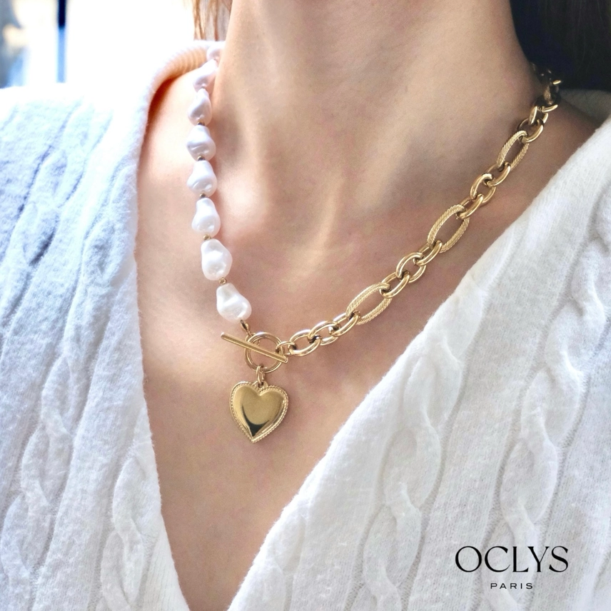 Deze prachtige Aurora halsketting van Oclys Paris is gemaakt van stainless steel en heeft een robuuste goudkleurige schakelketting en geregen parelmoeren kralen. Daarnaast is de ketting voorzien van een hartvormige bedel. Deze elegante halsketting combineert klassieke en moderne elementen en is gegarandeerd nikkelvrij, cadmiumvrij en loodzoutvrij.