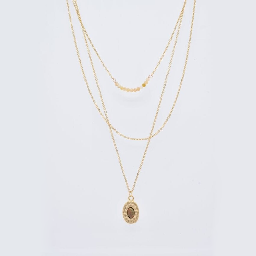 Drie rijen ketting in goud staal met natuurstenen.