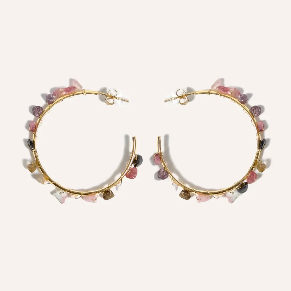 Deze prachtige sierlijke oorbellen brengen de Ibiza vibes mee terug naar Nederland. Ze zijn gemaakt van roestvrijstaal en voorzien van creolen met diverse kleine natuursteentjes voor een unieke look. Shine on!