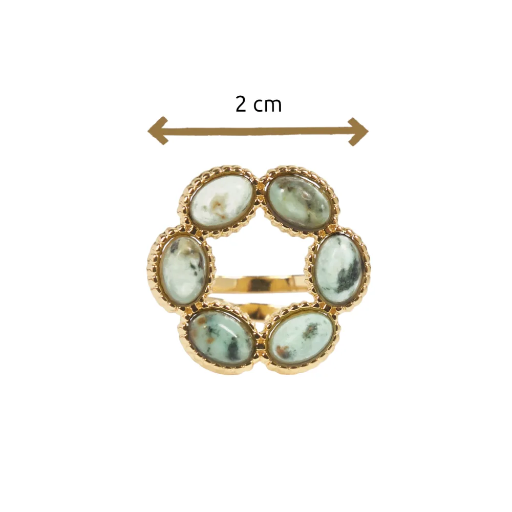 Deze prachtige goudkleurige ring van Stainless Steel is uitgevoerd met een krans van ovalen parelmoer natuursteentjes in een goudkleurige omlijsting.